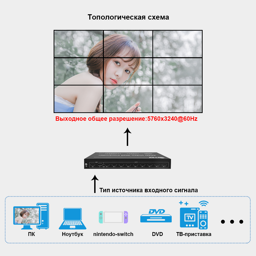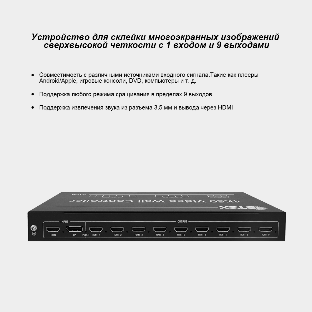 - Это поддерживает 1 вход HDMI/DP и 9 выходов HDMI.