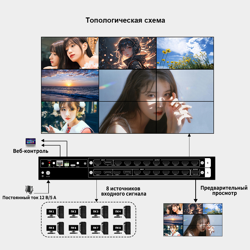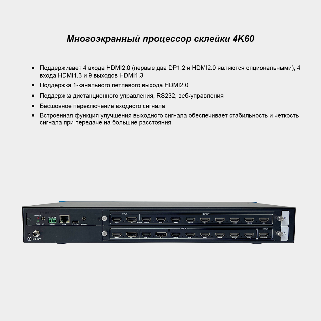 Поддержка многоэкранного отображения, вы можете объединить сигнал на одном экране вывода, а также отображать разный контент на нескольких экранах. -