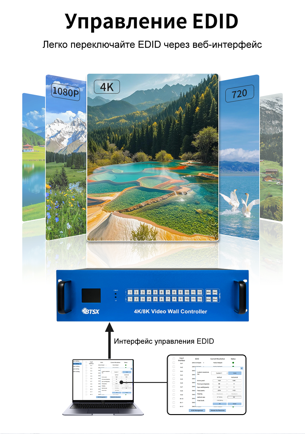- Поддерживает настройку разрешения независимой видеокарты и управление EDID. Вы можете создавать и сохранять пользовательские EDID через веб-интерфейс.