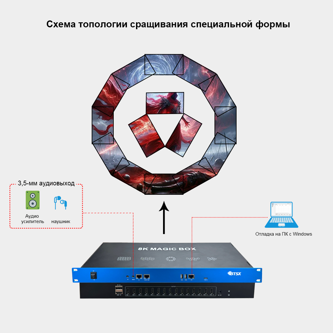 - Можно соединить 15 экранов под любым углом и в любой форме